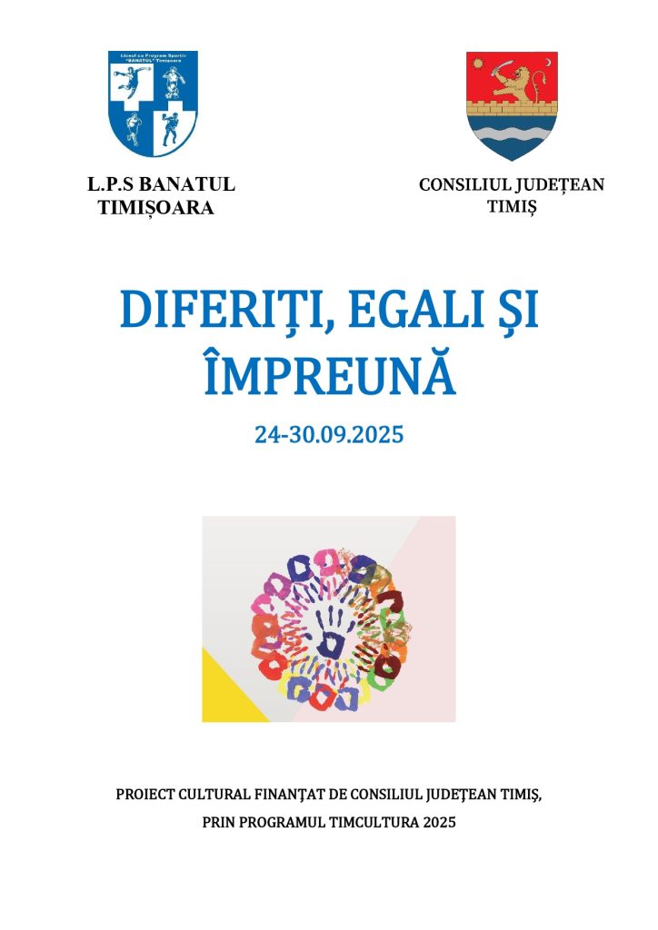 În perioada 24 – 30 septembrie 2025, se va desfășura la LICEUL CU PROGRAM SPORTIV BANATUL proiectul DIFERIȚI, EGALI ȘI ÎMPREUNĂ, proiect cu finanțare nerambursabilă de la CONSILIUL JUDEȚEAN TIMIȘ, prin programul TimCultura 2025.